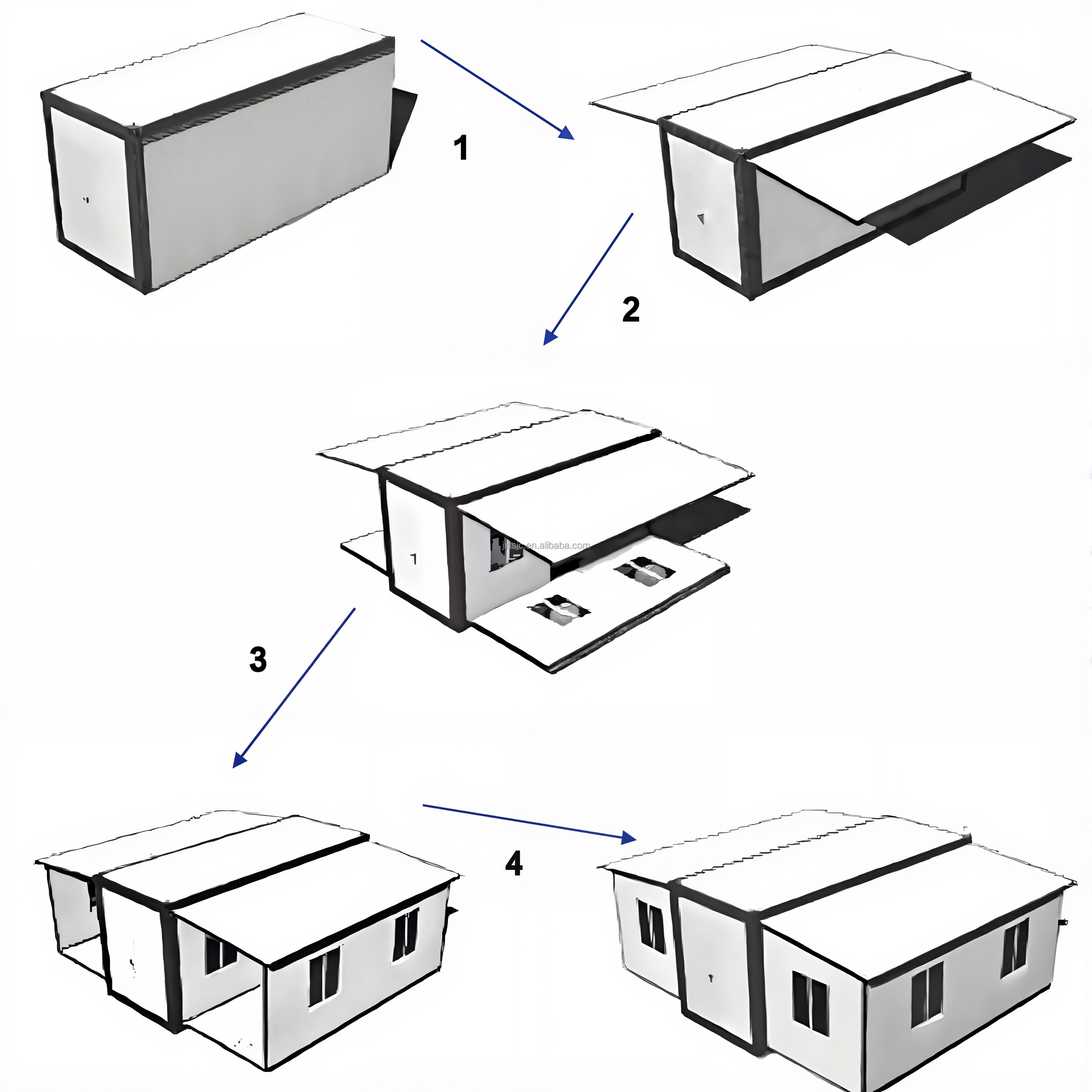 Ten duży, prefabrykowany dom kontenerowy z sypialnią został zaprojektowany z myślą o potrzebach m...